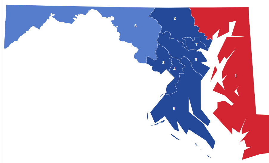 Maryland’s 2012 gerrymander was one of the ugliest in the country, and yet…not as dramatic as it could have been. Dems targeted MD-6 in western Maryland but left MD-1 on the Eastern Shore and northern border as a Republican seat. This time around they tried to get more aggressive but courts stopped them, resulting in a map that keeps MD-1 safely Republican and potentially puts MD-6 back in play.
