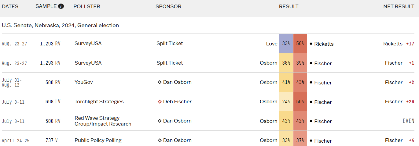 Nebraska has a pair of U.S. Senate elections this year…and one of them is looking competitive. That’s typically not the case for statewide elections in Nebraska, of course. Quick background: there’s a special election to fill the seat Ben Sasse vacated to engage in an 17-month grift on behalf of himself and his friends as president of the University of Florida. Former governor Pete Ricketts, Sasse’s appointed successor, is expected to easily win that race and serve out the rest of Sasse’s term through 2026. But there’s also the regularly-scheduled Senate election, where two-term GOP incumbent Deb Fischer appears to be in a spot of trouble against independent Dan Osborn. We’ve seen a version of this movie play out before, where the plucky independent candidate polls well against a not-especially-popular Republican incumbent on the Great Plains before partisanship catches up and the Republican pulls away. That’s probably what will happen here…but it’s worth considering both the past example, and why this case might be different.