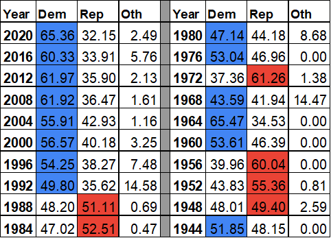2020 Presidential result: Biden 53.9%, Trump 44.1%