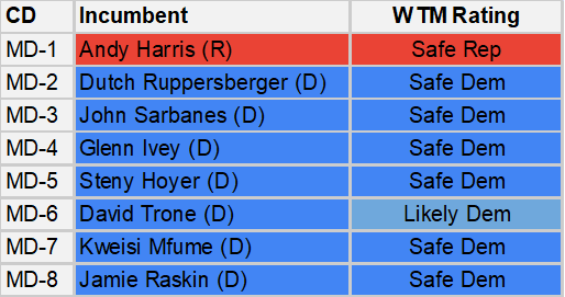 For the third cycle in a row, the Republican nominee in this district is Neil Parrott, a businessman and former twelve-year member of the Maryland House of Delegates from Hagerstown. He’s deeply conservative, with his political roots in the Tea Party movement of 2009-10 and an unsuccessful referendum effort to overturn Maryland’s legalization of same-sex marriage. Parrott’s views tend to fit the western part of the district, but are anathema to the southern portion closer to DC, and are increasingly out of favor in the purple Frederick area. It will be difficult for him to assemble a winning coalition in a seat where the highest-propensity voters are the most Dem-inclined, and vice versa. That said, I think choosing another Delaney as the Democratic standard-bearer here was not a terribly wise choice by the party’s primary voters. I have it at Lean Dem; Jim and Matt rate it Likely and Safe, respectively. Averages out to Likely.