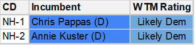 Republican state legislators attempted to dramatically change the state’s two Congressional districts in 2022, something that is historically not really done here. Their idea was to create one safely Democratic district and one safely Republican district, as opposed to the two moderately blue but basically competitive districts that were in place. With Republican governor Chris Sununu bucking his party and threatening a veto, a stalemate ensued before the state Supreme Court intervened and appointed a special master with minimal change to the 2010s map. So New Hampshire continues to have two seats that lean Democratic but could go Republican with strong candidates and/or a GOP-friendly national environment. This is not that year, so both seats are looking likely to stick with Dems – but a contentious primary in the open-seat 2nd district might have created a slight opening for the Republicans.