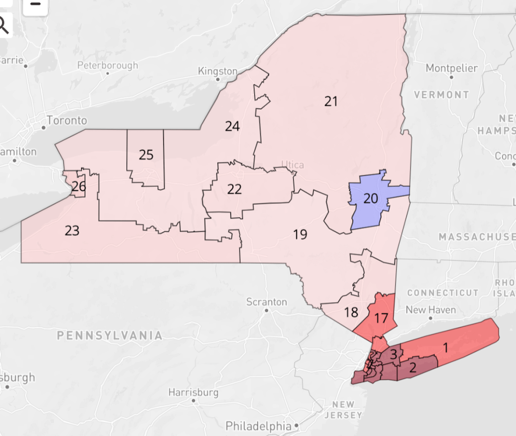 After the state legislature’s efforts to draw a Congressional district more or less in line with the suggestions of Democratic Congressional Campaign Committee chairman (and then-Congressman for the mid-Hudson Valley, Sean Patrick Maloney) crashed and burn in a series of legal defeats, a special master was appointed by a Republican judge to draw the maps for the next decade. The special master made odd choices here and there, but the districts were mostly compact with plenty of competitive seats – and indeed four of them flipped to Republicans. One, captured by noted fabulist George Santos, has already flipped back to Democrats in a special election following Santos’ expulsion from the House after his federal indictment. For 2024, the state courts decreed the “independent” redistricting commission should take another shot. They furnished a ridiculous incumbent-protection map, which the state legislature promptly rejected. Lawmakers drew a new map with modest changes, but without the dubious features of the commission map. Its biggest change comes in Central New York’s 22nd district, as we’ll discuss below. What doesn’t change is that New York is arguably the biggest House battleground this year, with seven competitive seats (if we include the just-about-safe NY-3). Their profiles follow below.