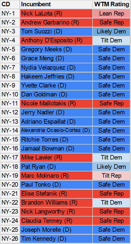 This year, Ryan’s opponent is Alison Esposito. A former NYPD officer who was born in Orange County but lived until recently on the Upper East Side of Manhattan, she was Lee Zeldin’s pick for lieutenant governor on his 2022 ticket. The National Republican Congressional Committee (NRCC) considered her a prized recruit but she hit the ground slowly in terms of fundraising. Nonetheless, they’ve continued to pour money into her race – mostly hitting Ryan on the same stuff as Molinaro and Schmitt before her: marching with “extremists” who wanted to “defund the police.” It’s important to note that the march they’re referencing was in fact a peaceful, bipartisan march in the summer of 2020 where Ryan walked arm-in-arm with Marc Molinaro. Dishonesty aside, Esposito’s profile is a mixed bag. The Hudson Valley is accustomed at this point to people moving here from the city to run for office, from both parties. At least she does have some Orange County ties. This is a part of the country that elects law enforcement veterans to public office all the time, so Esposito fits the standard in that respect. For his part, Ryan has been campaigning with the full spectrum of Democrats, from Alexandria Ocasio-Cortez to Kathy Hochul. He’s pretty confident in his own political skin and the district has an increasingly reliable Democratic performance, with its high turnout in places like Beacon and Rhinebeck. If Democratic fortunes are not collapsing, he should win again. Matt has him listed as Safe; Jim and I are Leans. That averages out just ever so slightly on the Likely side.