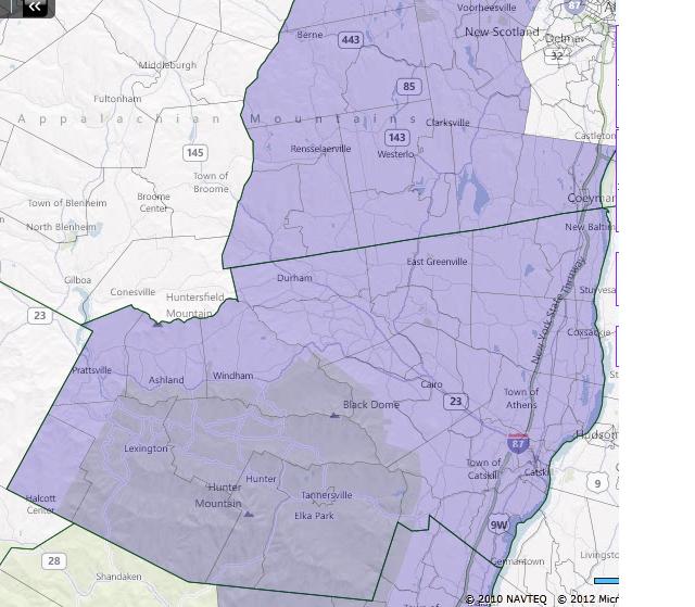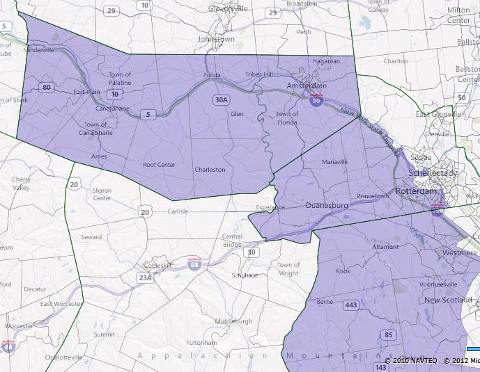 Looking into the individual components of the district, Montgomery County has been trending away from Democrats for a long time – Dukakis won it despite barely carrying New York in 1988, but McCain won it by 8 points in 2008. Obama barely improved upon Kerry’s performance there, a trend seen in several of of upstate’s older industrial cities. Andrew Cuomo barely beat Carl Paladino in Montgomery in the 2010 gubernatorial race. The district features some bluish Albany suburbs, connected to Montgomery by a small (and basically red) piece of Schenectady County. Further south, Greene County sees the occasional Democratic success at the town level and a few Democratic county legislators but is mostly Republican at all levels of government – Cuomo edged out Paladino by fewer than 400 votes – and has provided its current senator (Jim Seward of the 51st district) with comfortable margins during the last decade.